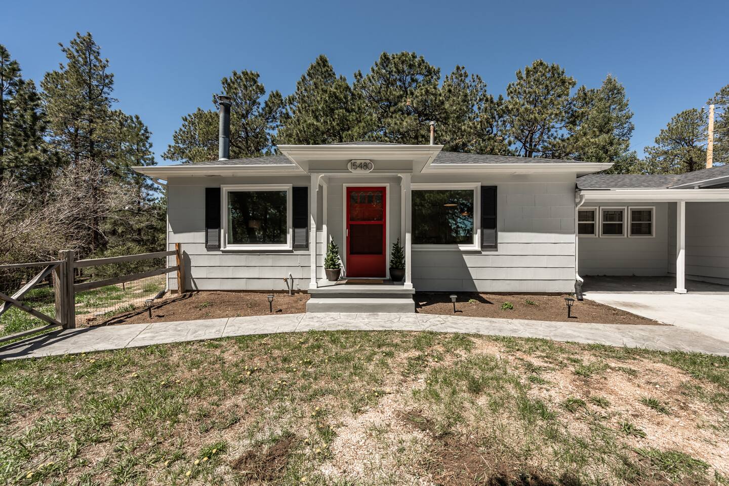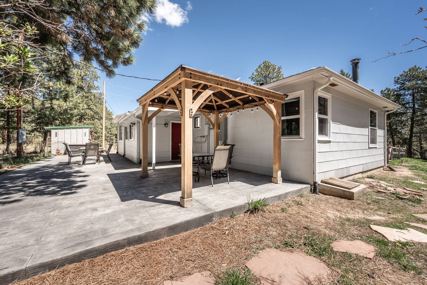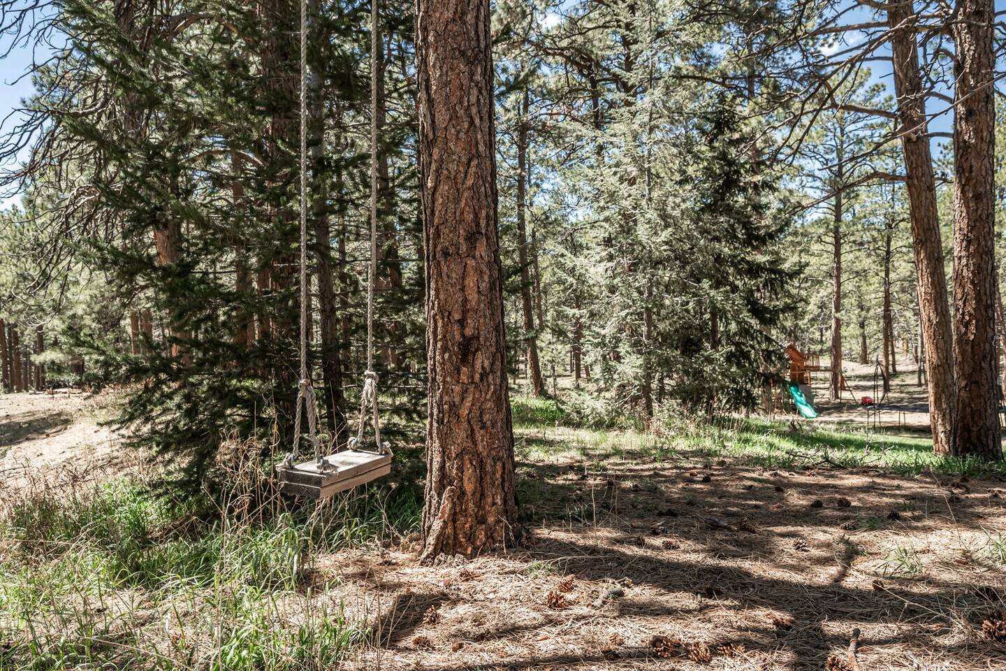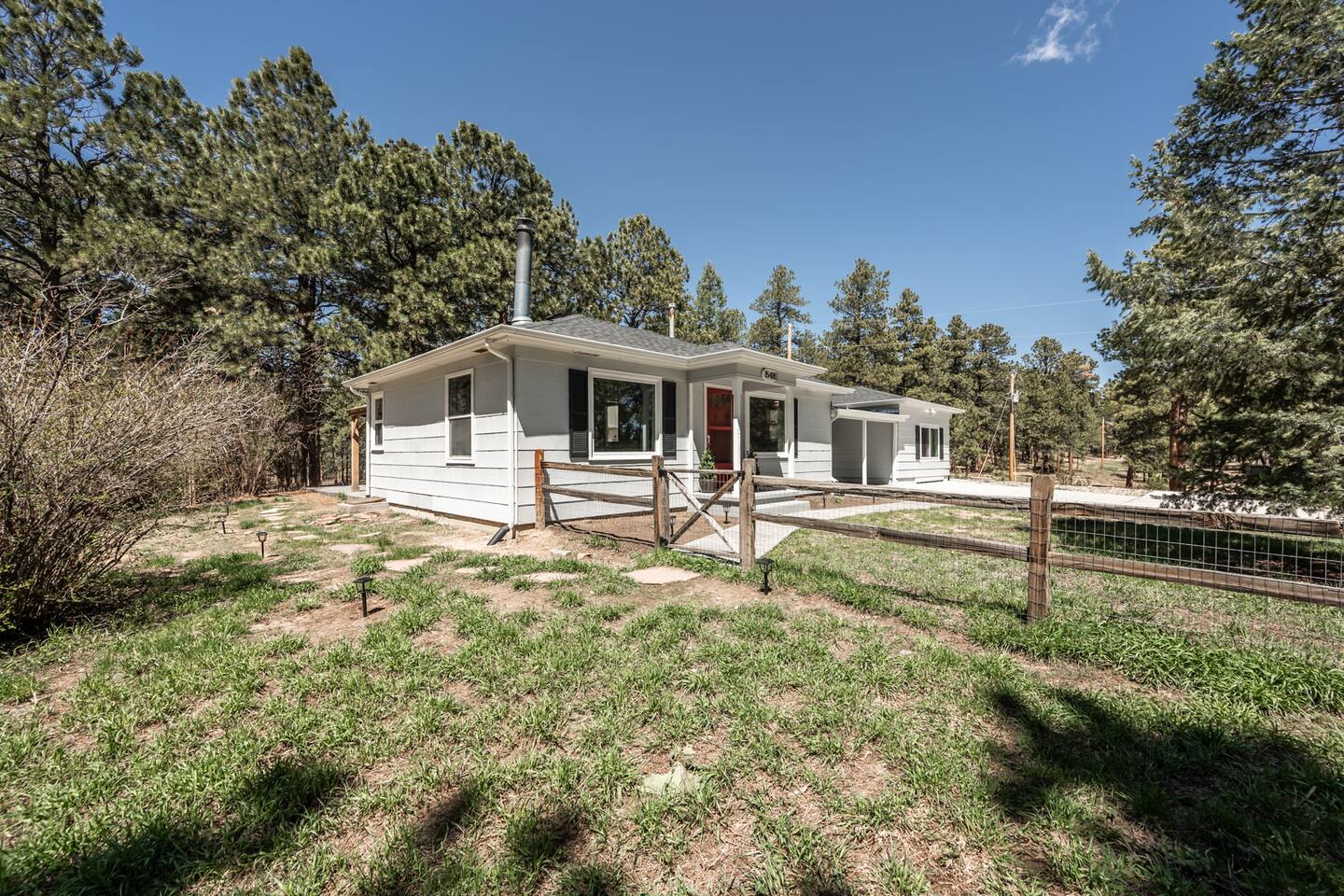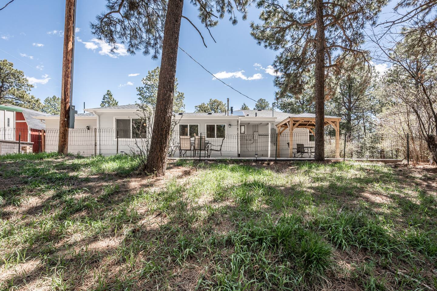 Tucked away in a landscape of soaring Ponderosa Pine Trees, this 5 acre family rancher offers a peaceful, comfy forest getaway in beautiful Black Forest. Located 15 minutes from USAFA. Remodeled in 2024 by an Air Force family, you’ll love the thoughtfully designed & inviting living spaces. Enjoy the fenced in portion of the yard or wander past the tree swing to the acreage & play equipment. Make memories with a game night or time under the lights on the back patio. 2 Primary King bedrooms!