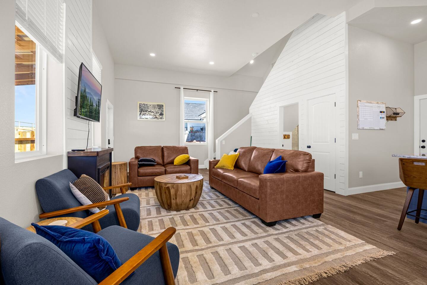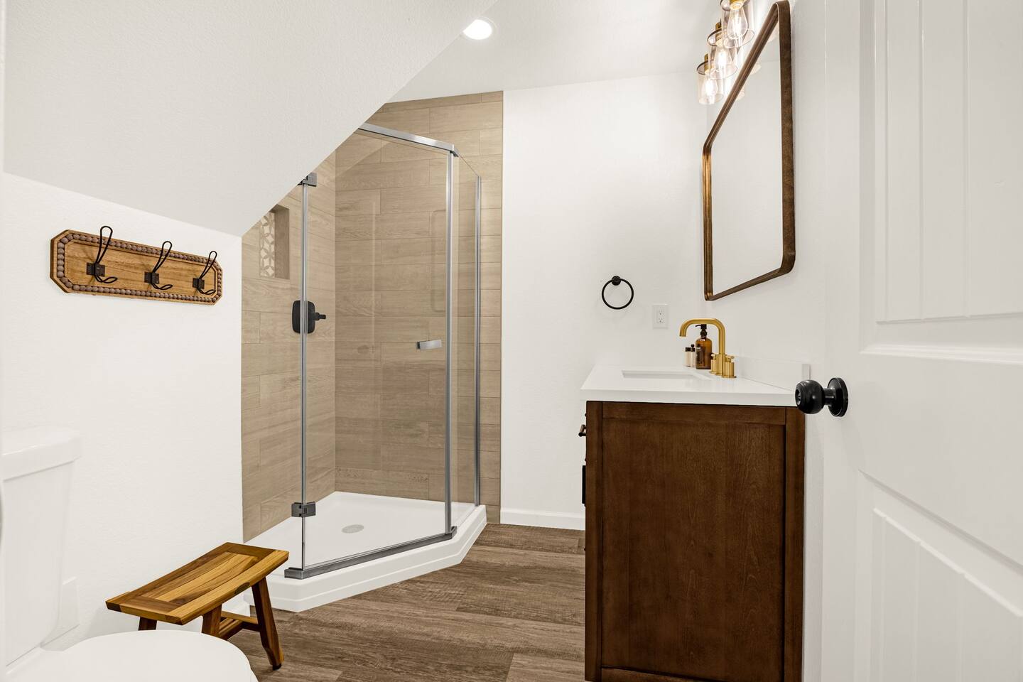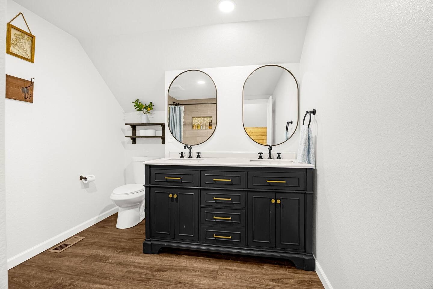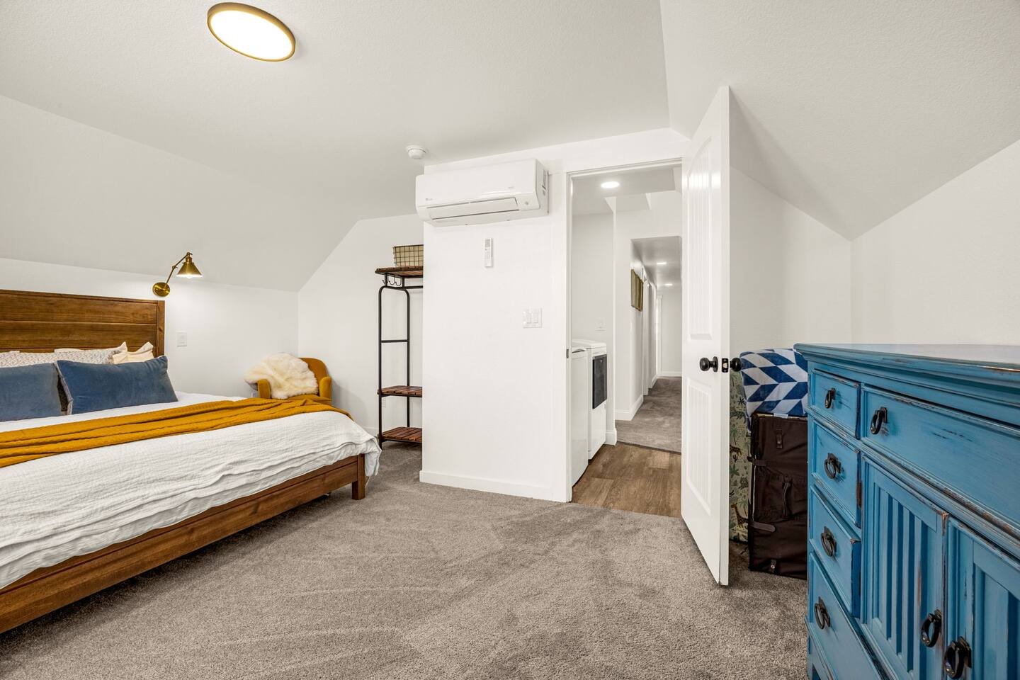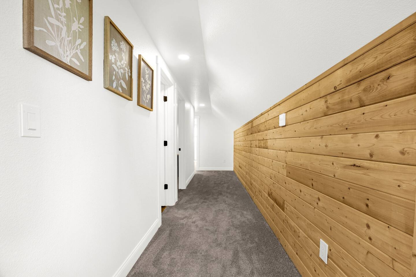 The Sunset Hill guest house shares 5 acres and is just south of the properties main house. Park directly in front of the Barndo and enter through the pedestrian door. You’ll walk into the two car garage that has been converted into a family game room. Enter the house into the kitchen and living room area. There is a full bathroom on the main level. Upstairs you will find all four bedrooms, another full bathroom and a laundry nook.