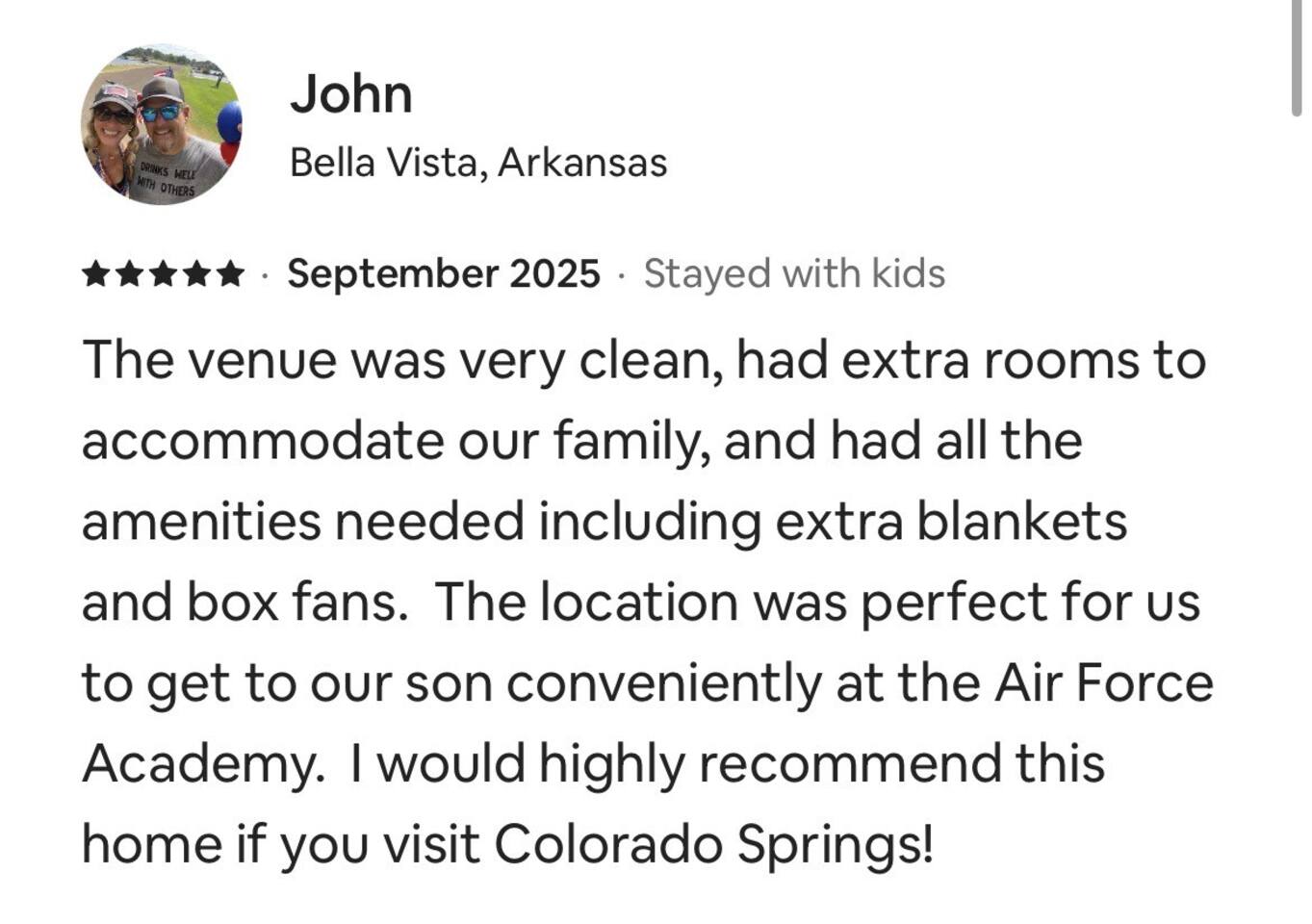 Just a 20 minute drive to the U.S. Air Force Academy -25 minutes away from the Garden of the Gods -47 minutes from Pikes Peak Highway Tollgate -25 minutes to Downtown Colorado Springs -30 minutes from the Colorado Springs Airport -1h20m from the Denver International Airport Have the best time!