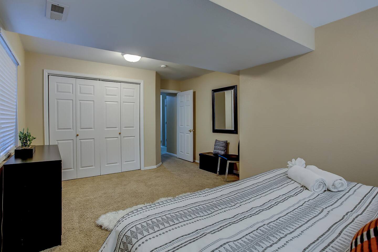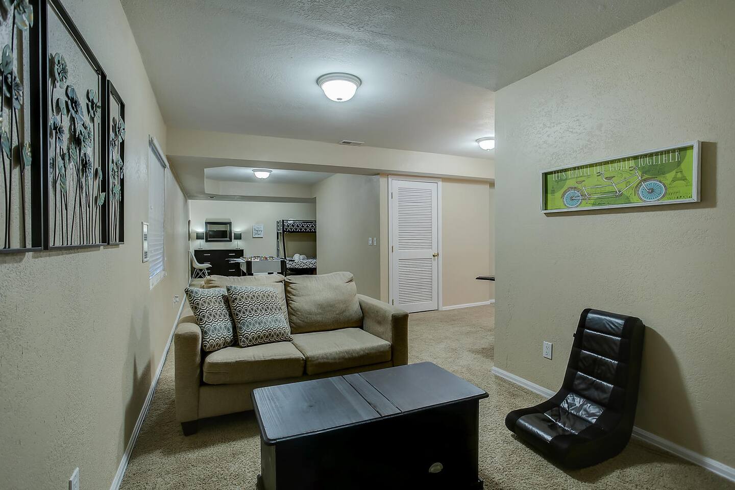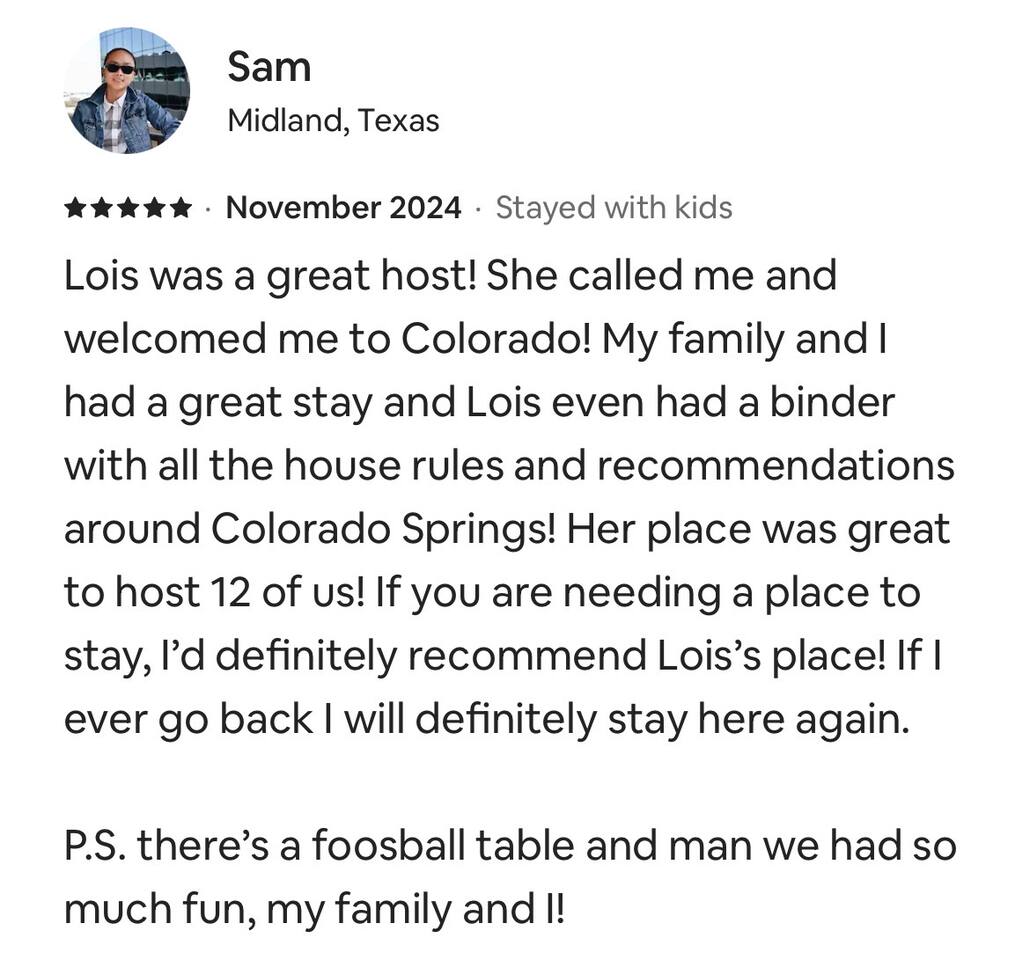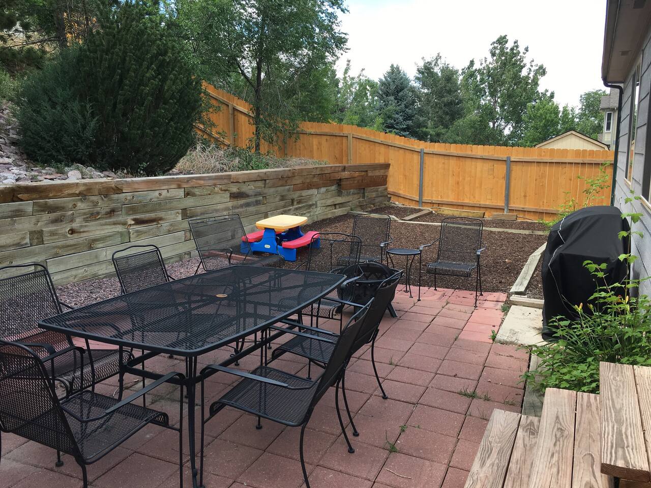 A master and two bedrooms, kitchen, dining area, living room, and guest bath are all located on the main level. A flight of stairs leads to the lower level where there are two more private bedrooms, a semi-private bedroom, a bathroom, laundry facilities, and a large open area with additional sleeping accommodations. Private back yard has a large table, grill, and fire pit for guests to use. Smart TVs are located in the living room, master bedroom, and lower level, all with Xfinity cable access. Lower level TV area has a DVD player to watch movies. Sofa bed is a small twin size. The home is centrally located so that going north, south, or west you are only 20-30 minutes away from so much that Colorado Springs has to offer: Garden of the Gods Park, Old Colorado City, Peterson Air Force Base, The Broadmore Hotel, Seven Falls, Manitou Springs, Fort Carson, Pikes Peak and Cog Railway, Cheyenne Mountain Zoo. For the security of the home and our guests there is a motion activated camera located in the front doorbell outside.