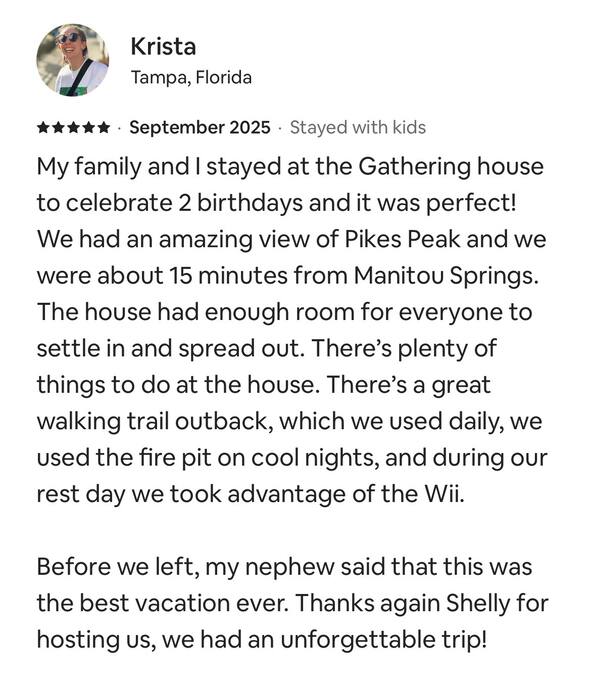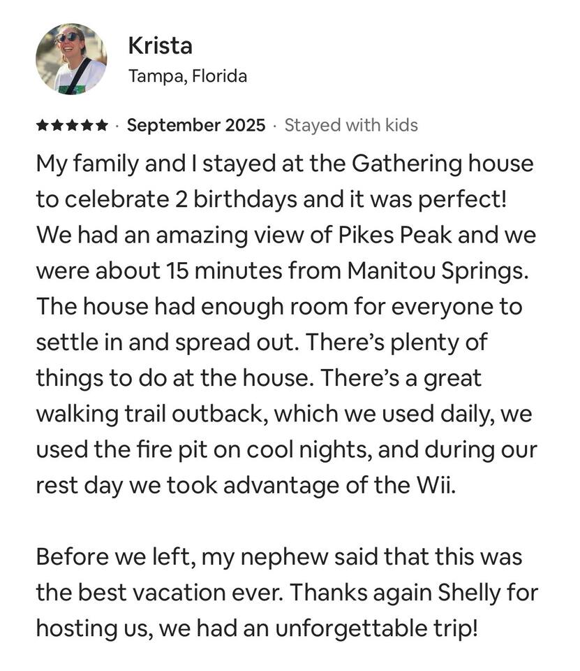 The location & view are a gem. The Gathering House is a tri-level home. 3 Bedrooms upstairs, 1 basement bedroom, 4 baths, a living room, family room, dining room, laundry room, & remodeled kitchen. The family room has comfy couches, a TV, a console with gaming system, & board games as well. The kitchen should have the utensils and appliances you need, including a keurig, press, and standard coffee maker, microwave, toaster, bottle opener, etc. The Master bedroom has a large walk-in closet, attached bath, and a vintage toddler bed. You also have access to the garage. There is a large backyard with trails that start right behind the house. There is a park with play equipment just a five minute walk away on Delmonico. This house is 10 minutes from Garden of the Gods, 10 minutes from USAFA, 10 minutes from Downtown, Old Colorado City is 15 minutes away, & Manitou and the Incline are about 20. It is centrally located. License # A-STRP-23-0458 Our goal is to offer you every amenity stated in our listing. That being said, sometimes things break and some amenities may not be available for part or even all of your stay & are typically not reimburse able. If you notice a problem, we trust you will bring it to our attention right away. If we know of an issue we will fix it ahead of your stay or notify you. We do our best to proactively care for the home and provide weekly maintenance to make sure everything is ready and in good working order for your stay. This is our 7th year as super hosts and we go above and beyond to help with any issue brought to our attention. We are here to make sure you and the house are cared for.